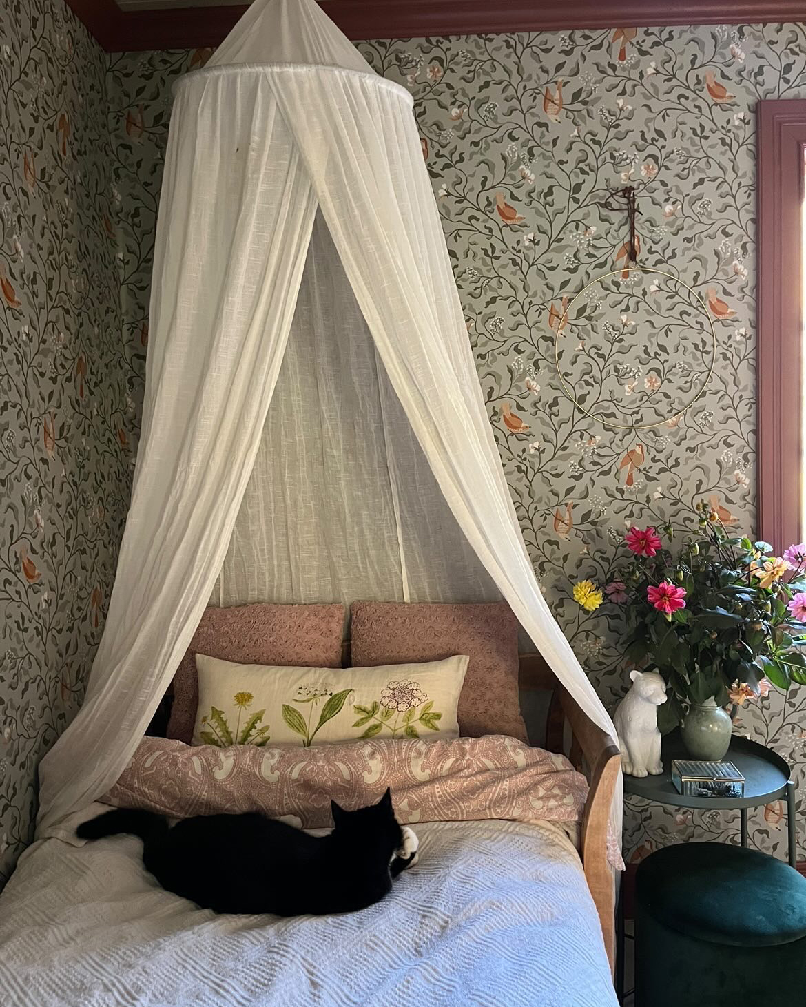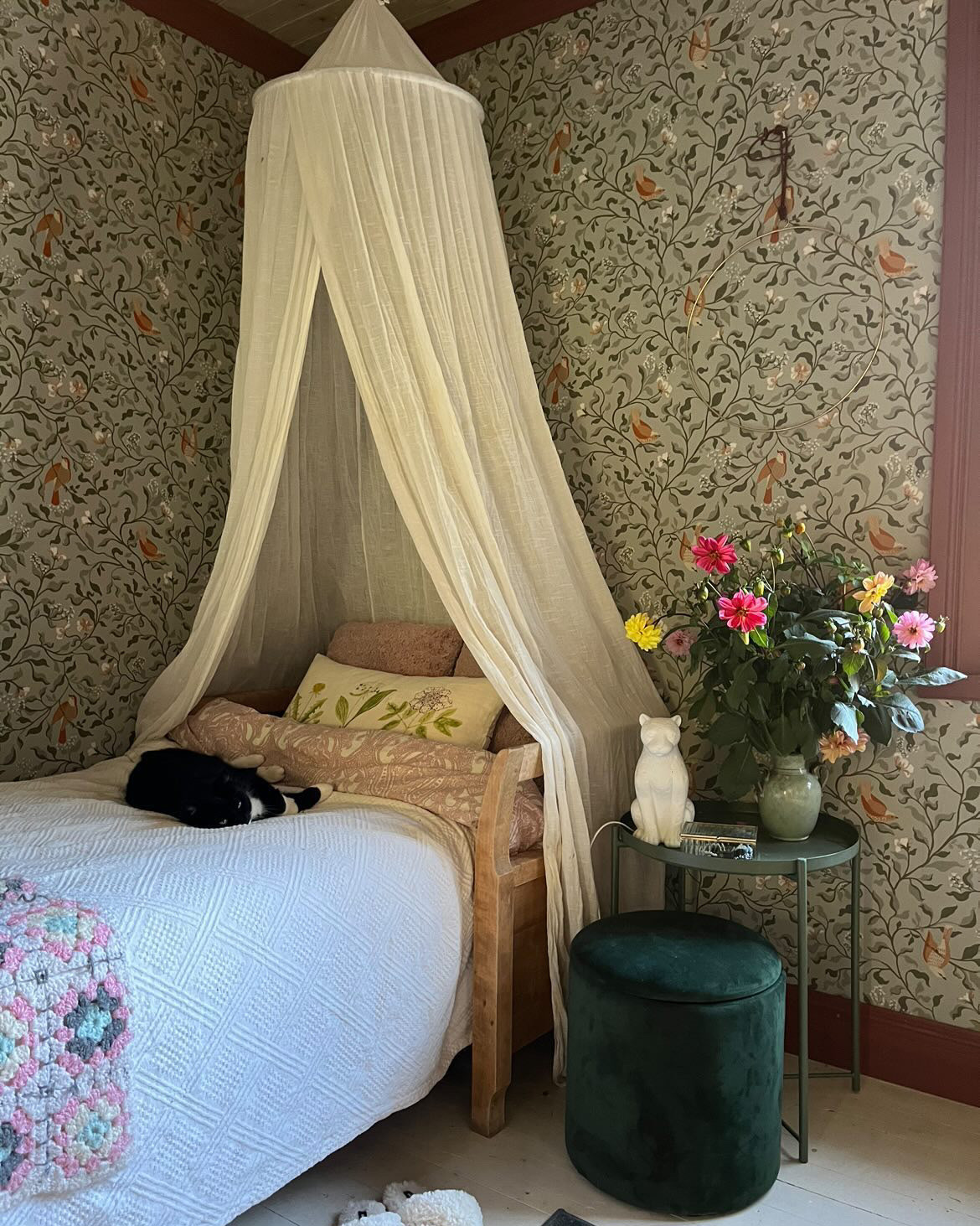 Flora är klädd i blommande mönster som för tankarna till sommar, fågelsång och en doft av regn. När vi öppnar fönstret mot trädgården släpper vi in en vind som får gardinerna att bölja och skapa mjuka skuggor över fint tecknade bladmönster.