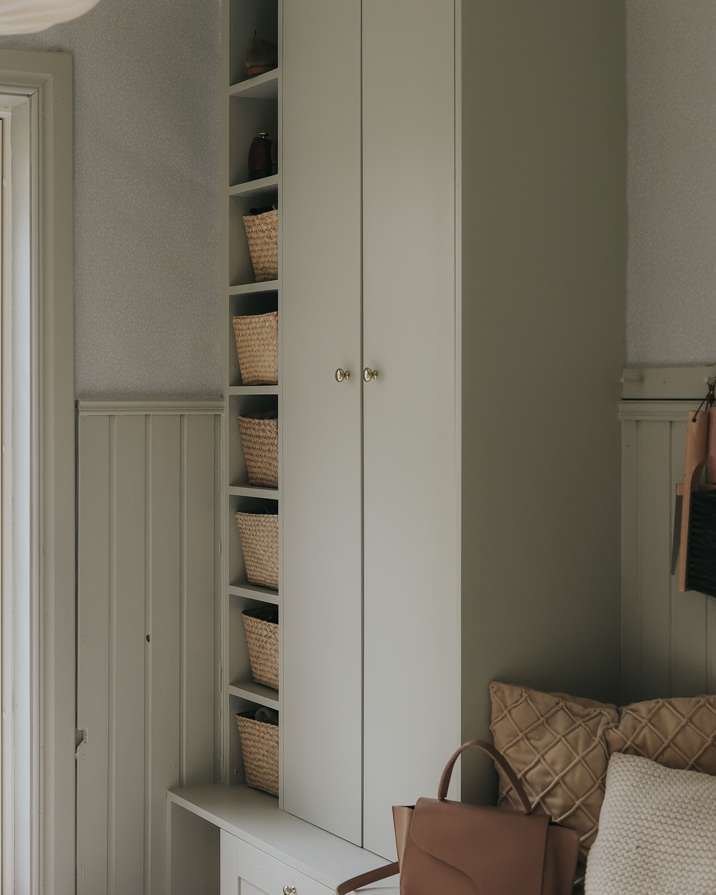 "Sista lilla pusselbiten på plats och ny tapet har fått komma upp över pärlsponten i hallen. Älskar kombon bröstlist av pärlspont och tapet. Det blir en sån mjuk och fin övergång och den här tapeten från Duro är så fin här i vår hall. Den heter Folke och kommer från deras senaste kollektion Flora som är fylld med en massa vackra tapeter i blommiga och bladiga mönster."