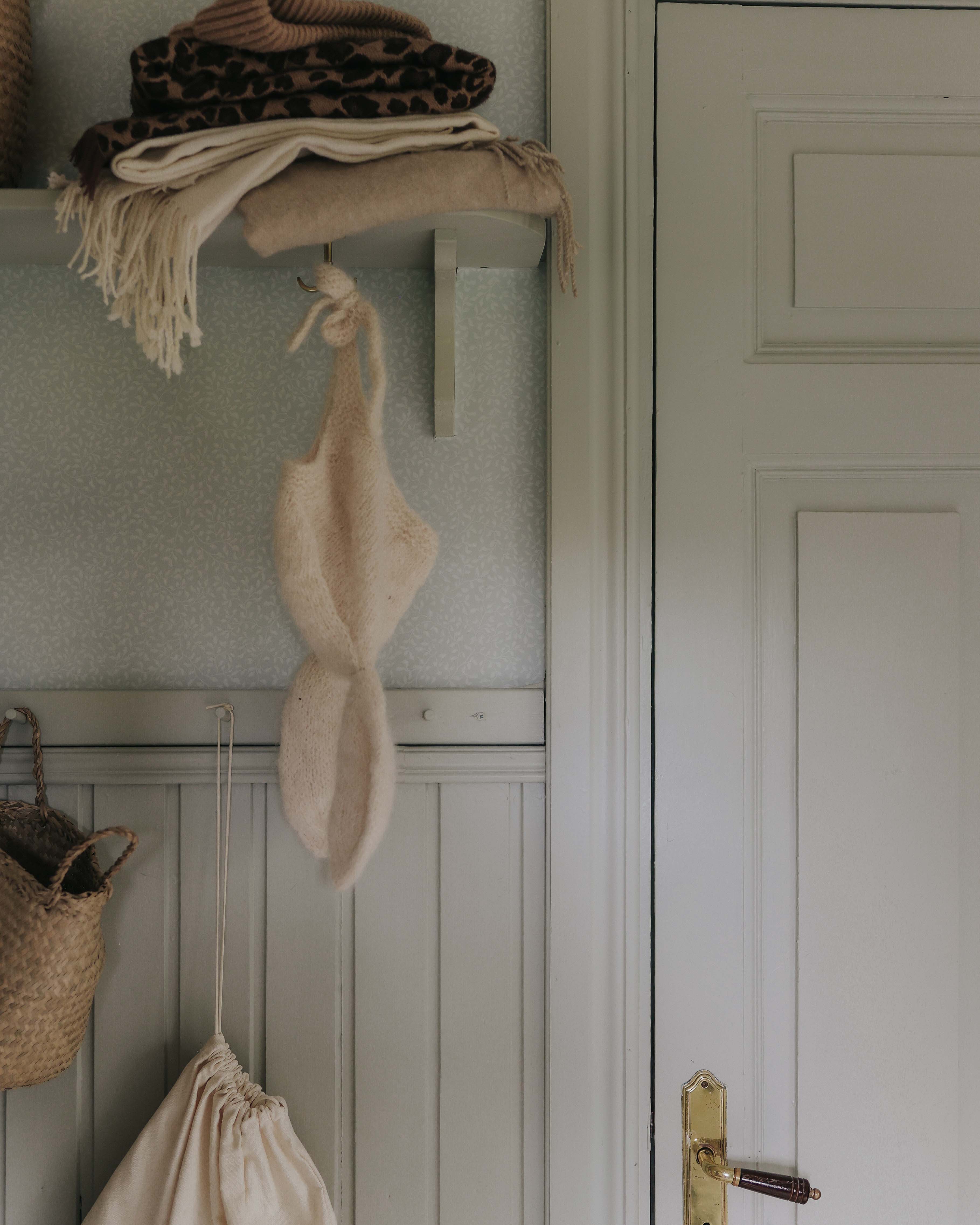 Hemma hos Jasmina Bylund välkomnas man av ljusa kulörer och små mönster. I ett samarbete med oss har Jasmina inrett sin hall med tapeten Folke från vår senaste kollektion Flora. Det är en rogivande tapet som på avstånd upplevs som enfärgad, men på nära håll syns motivet som föreställer sirliga små grenar.