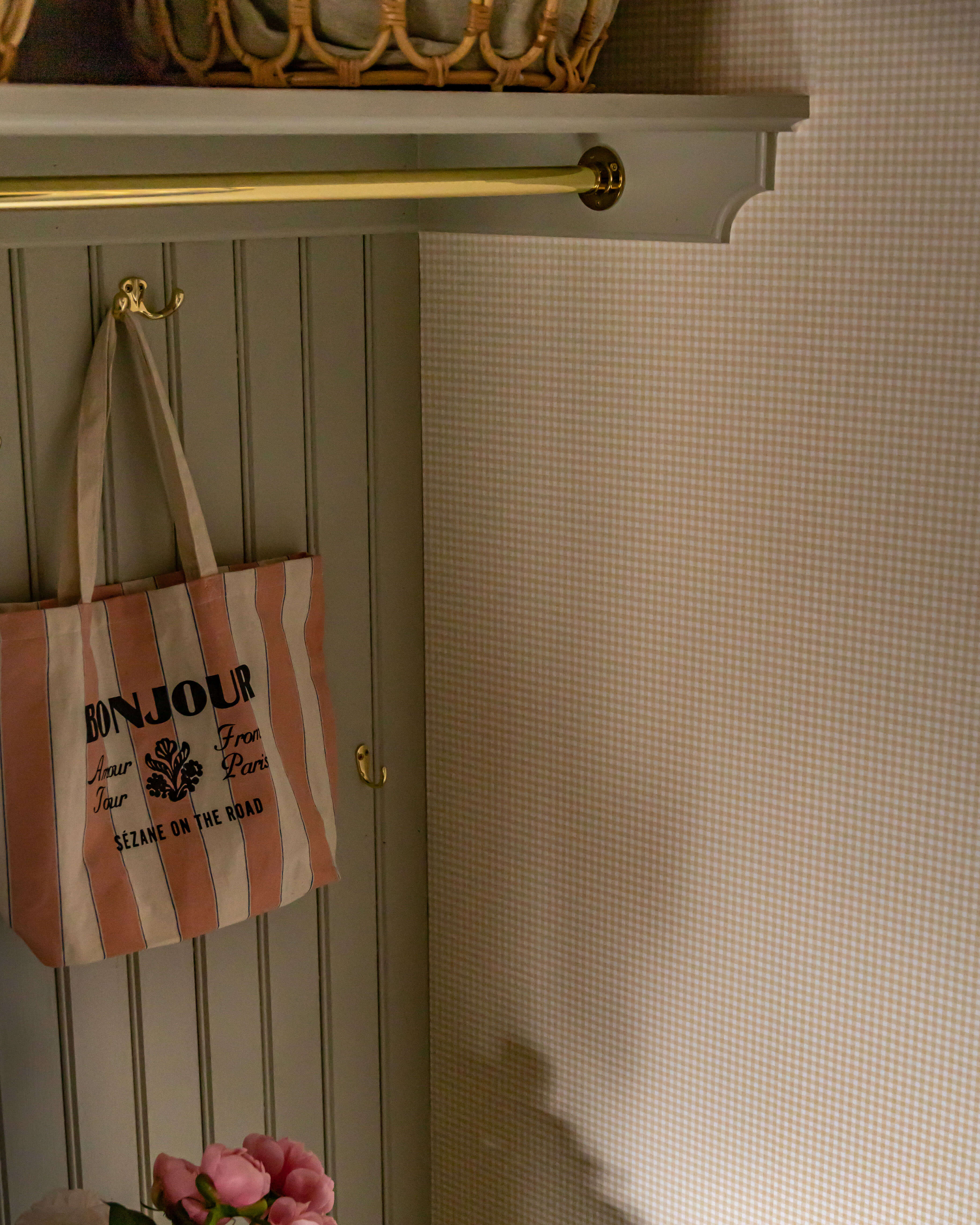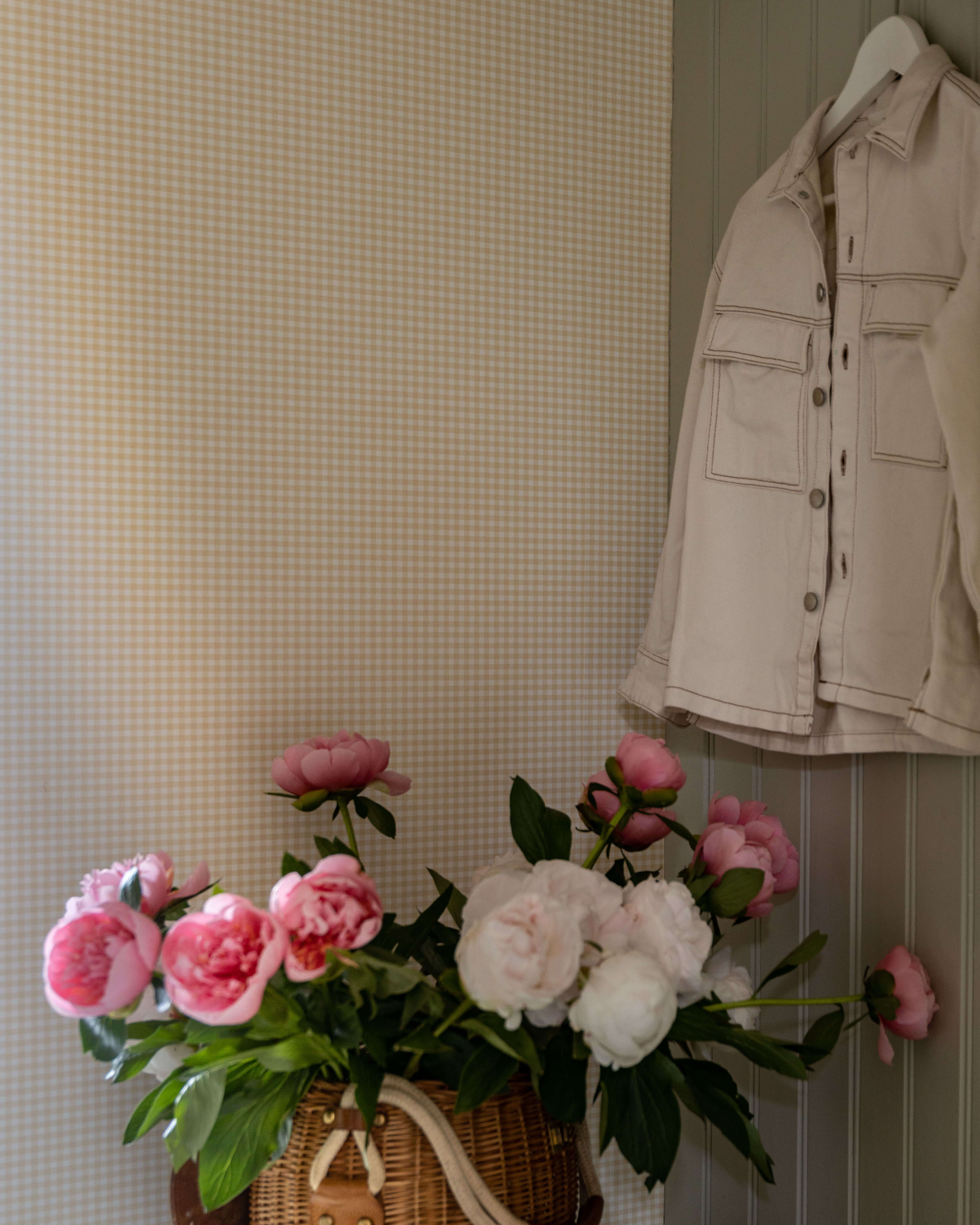 "Jag har gjort det - IGEN! Tapetserat. Så inget nytt under solen. Men det som är nytt för mig är att jag har valt småmönstrade tapeter i lågmälda färger från Duros senaste kollektion som heter just Småmönstrat. I vår hall har jag tapetserat Lotta i gul färgställning. Den har ett klassiskt rutmönster och blev ett sådant lyft för den här ytan som varit helt vit tidigare. Till vår lilla gästtoalett som saknar fönster blev smalrandiga tapeten Arvid, som är en tunn och mjuk ton-i-ton-rand, helt perfekt! Men - jag behövde något som gav kontrast så jag skar ut en tapetbård av tapeten Ingrid Marie från kollektionen Akvarell. Röda detaljer går ju som bekant som en röd tråd genom hela vårt hem och Ingrid Marie är on point den mest perfekta röda nyans man kan tänka sig, NCS-kod: S 4040-Y90!"