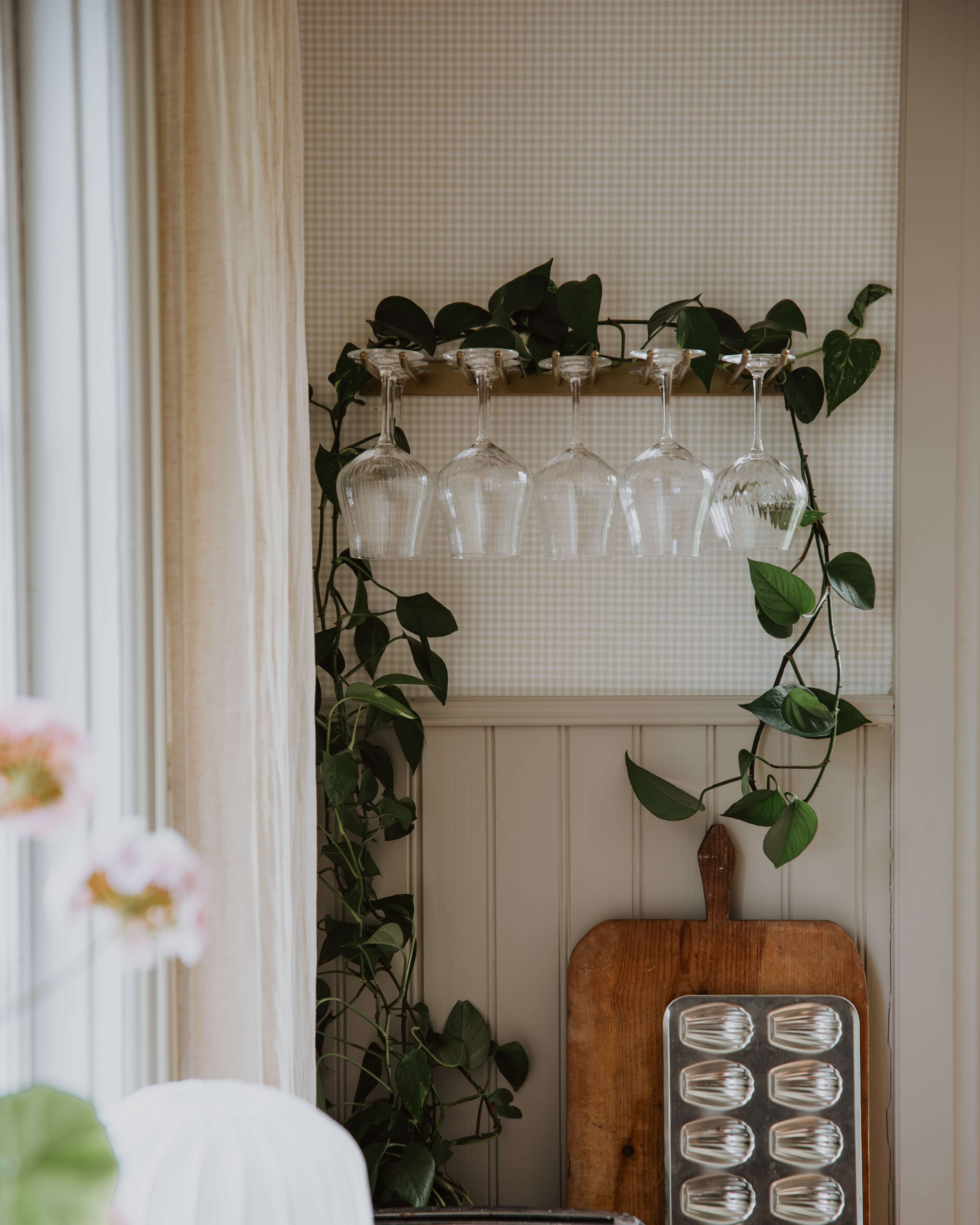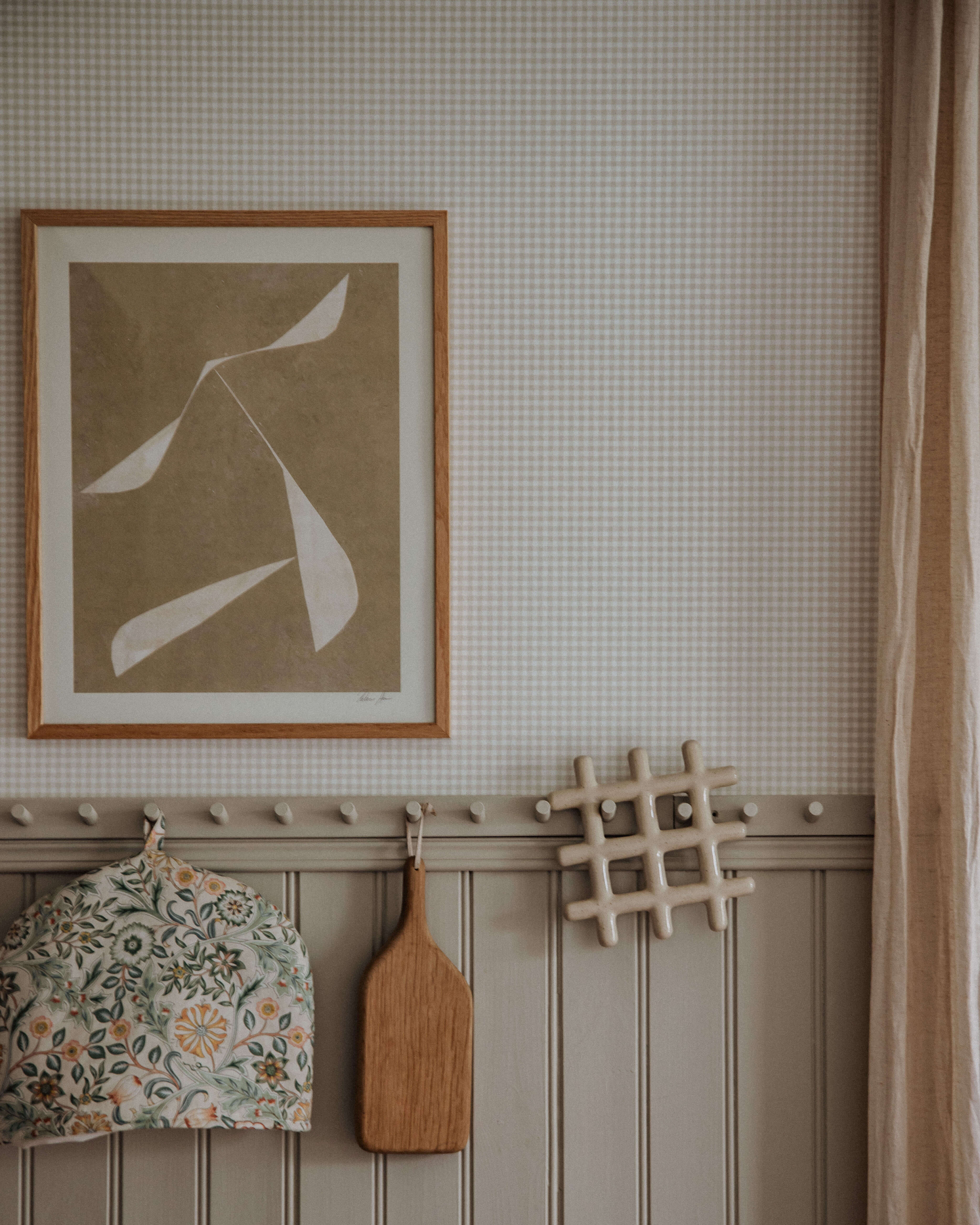 Stig in i det hemtrevliga köket hos kreatören Emelie Sundberg, där varma toner av beige och grått skapar en lugn och inbjudande miljö. I samarbete med oss har Emelie valt att ge köket ett lyft med tapeten Lotta – ett klassiskt rutmönster från vår senaste kollektion Småmönstrat. Tapeten passar perfekt pärlsponten som är målad i den mjuka nyansen NCS S 2005 Y20R.