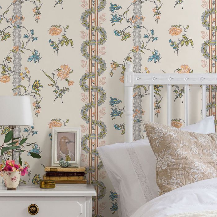 Förlagan till tapeten är blocktryckt och handkolorerad, och kommer från Stora Nyckelviken i Nacka. Det slingrande mönstret av blomrankor och sirliga spetsar tillhör rokokons mest älskade uttryck. Originalet, som kan dateras till senare delen av 1740-talet, pryds av en rik och klar färgskala och är ett av de mest eleganta exemplen inom sin mönstertyp.