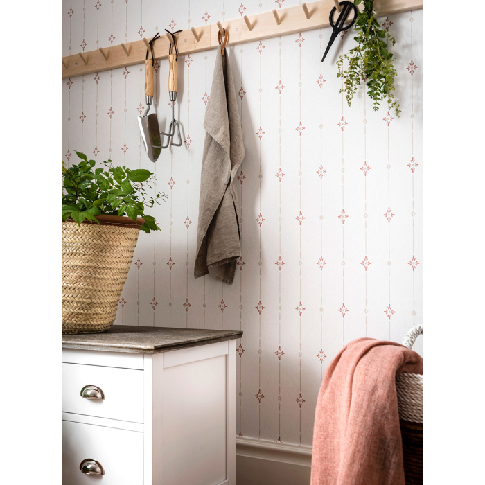 Under det tidiga 90-talet vaknade vårt intresse för ekologi. Vi tog till oss textilier av oblekt lin och bomull, möblerna var av obehandlade ljusare träslag och vi hade en längtan till landsbygden. 90-talets allmogestil innehöll både vita snickerier och färgstarka inredningar. Tapeterna skulle gärna ha en struktur i botten och färgerna var mättade. Randmönstret Britta, med sin lilla stjärna och streck, kombinerar en subtil bottenstruktur tillsammans med ett mönster i klar och mättad färg. Den finns med oss under hela tapethistorien och självklart även på 90-talet.