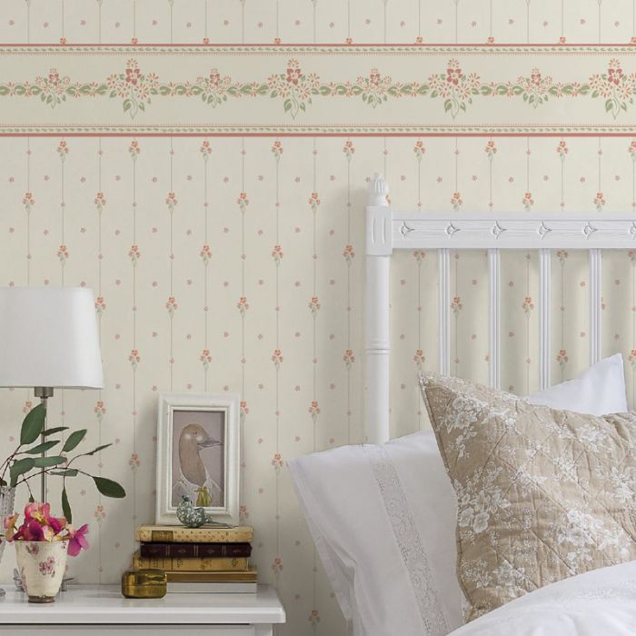 Ränder och små blommor skapar en tidlös tapet. Mönstret i det lilla formatet bidrar med en klassisk känsla och harmoni.