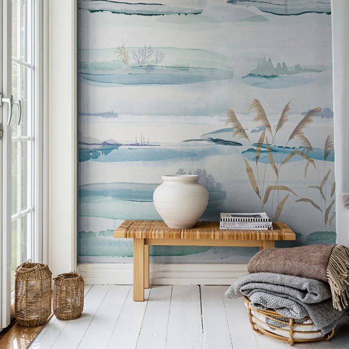 Kusten är en av våra muraltapeter. Muraltapeter avser mönster som sträcker sig över flera, individuellt tryckta våder. Mönstret är 2 m x 3 m och repeteras sidledes.