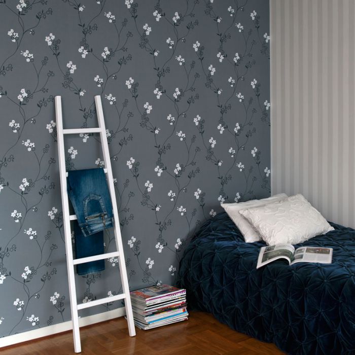 Lugna, spröda blommor som flödar över väggen. Skir är ritad med stilistiska figurer och böljande linjer. Tapeten finns i både ljusare och mörkare varianter som kan användas antingen som fond på en eller två väggar eller i hela rummet.