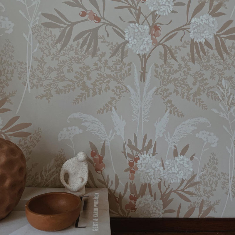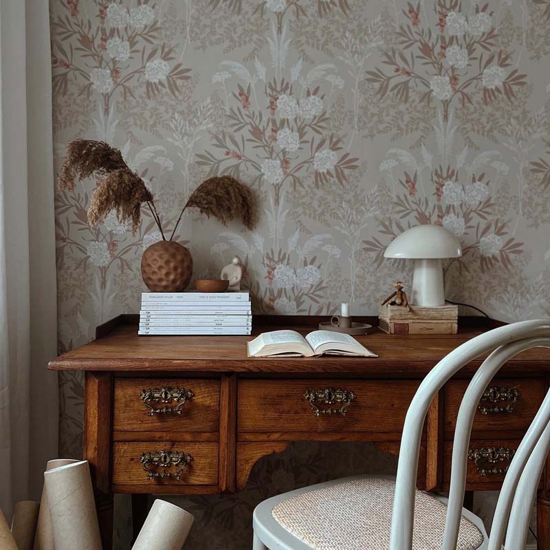 Hennes mål var att skapa en inbjudande kontorshörna på gården. Med tapeten Strandäng och det gamla skrivbordet de hittat i gömmorna på gården skapade hon en ljuvlig plats att arbete ifrån. Eller vad tycker ni?