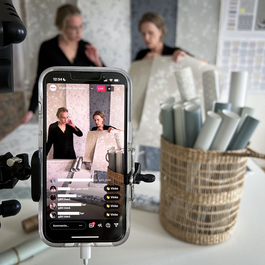 Varje tisdag sänder vi live från vårt Instagramkonto @durosweden, där du får vara med och ställa frågor eller bara vara åhörare. Sändningen håller på i cirka 10 minuter och ger dig tips om hur du hittar den röda tråden i hemmet, vilka tapeter som gifter sig bäst med varandra eller vad som är på gång hos oss just nu.