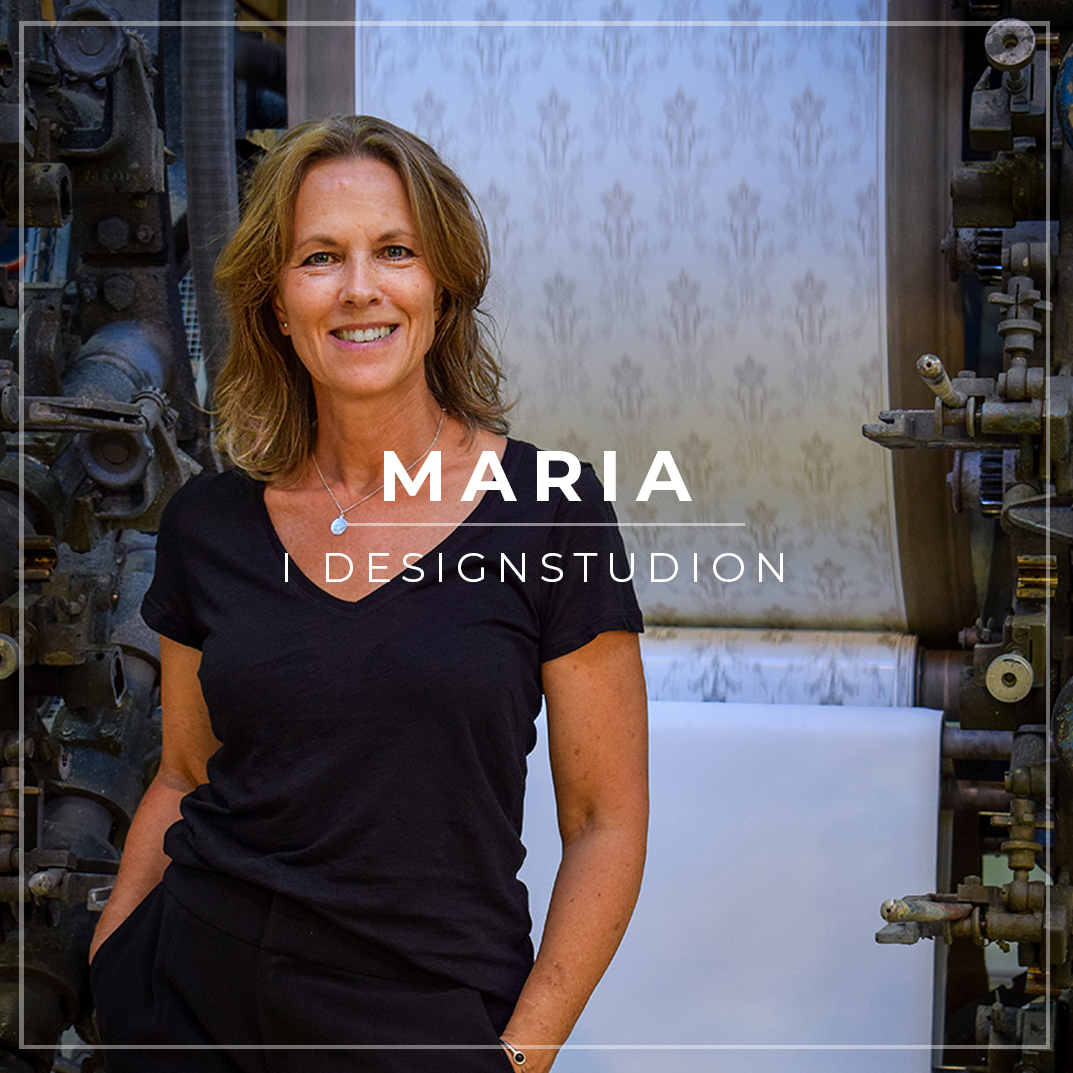 Maria har med säker hand lett designarbetet på Duro Sweden i mer än åtta år och är den som format kollektionen Hav & Land. Kollektionen lever i gränslandet där vattnet möter sanden och är resultatet av flera års arbete. Inspirationen till kollektionen och kanske framför allt till det stora självsäkra mönstret Strandäng har hon samlat på sig under många och långa promenader längs kusten. Maria har en nära relation till landskapet och hittar inspiration överallt.