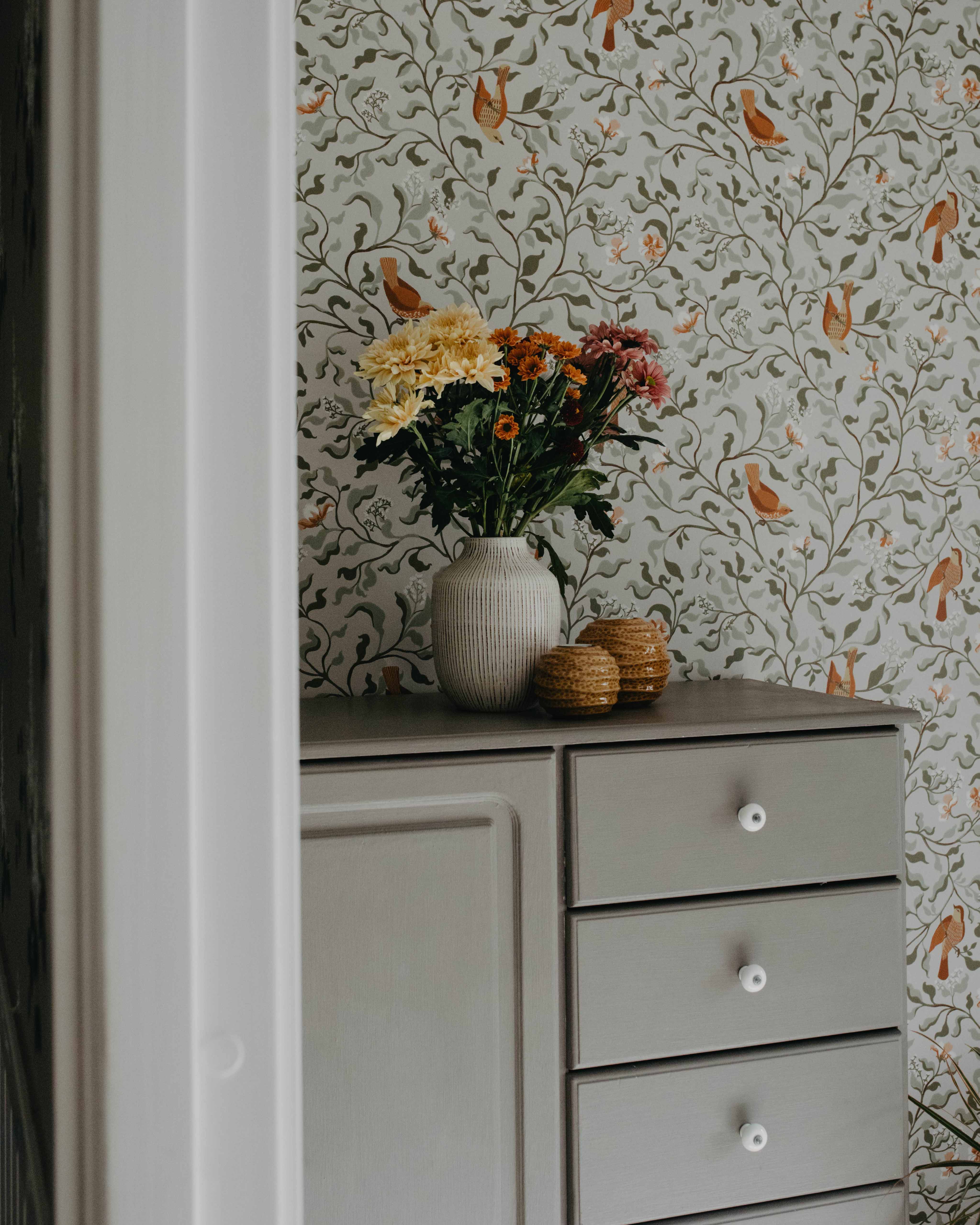 Fotografen och kreatören Johanna Cryer har i ett samarbete med oss inrett sitt kontor med vår tapet Josefin från kollektionen Flora. Med små fåglar och bladverk som pryder väggarna blev resultatet minst sagt ett drömlikt kontor som för tankarna till vår!