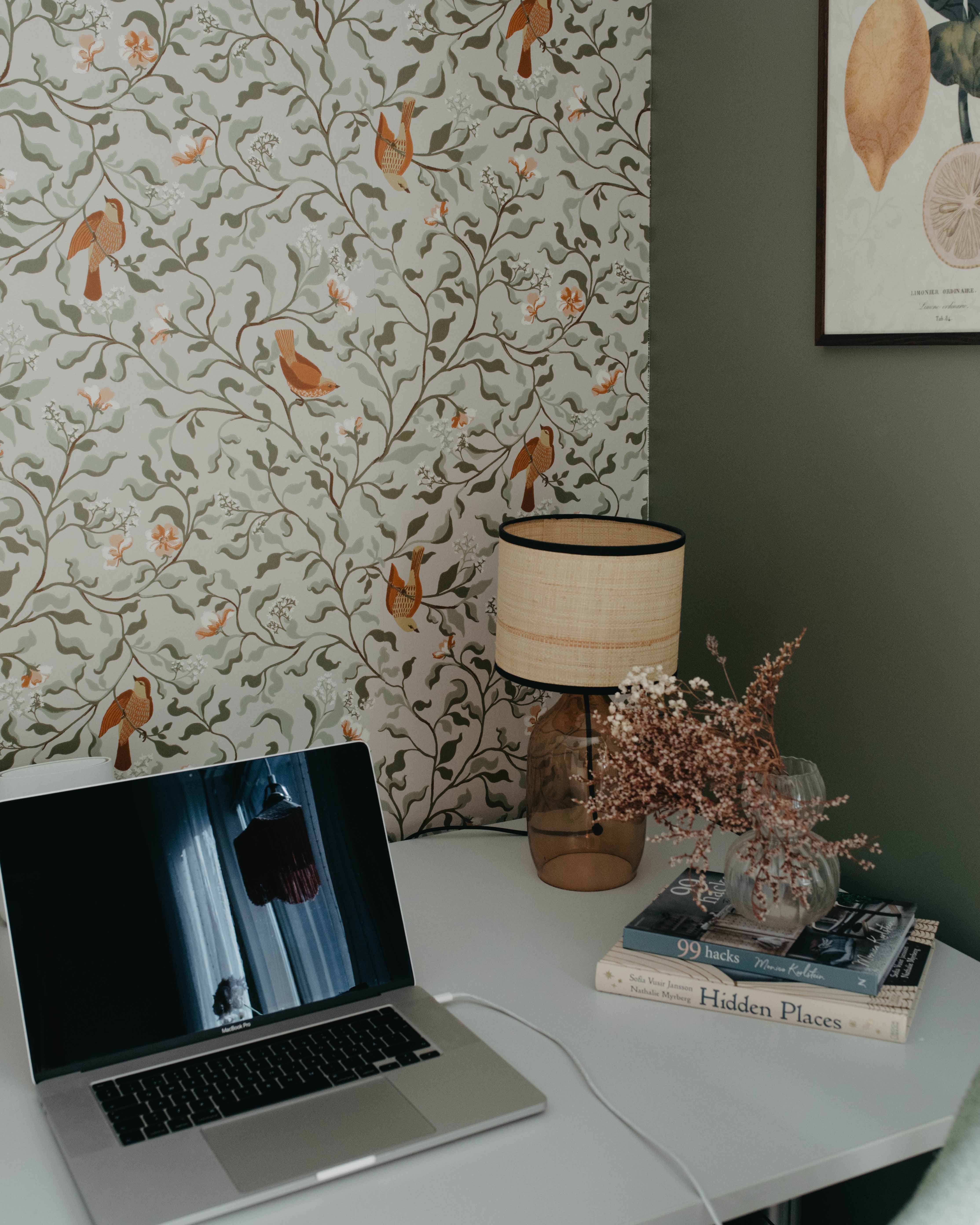 "Jag har förvandlat två barnrum till mitt eget välbehövliga drömska kontor. Gröna väggarna har alltid känts tröstande för mig, och i kombination med Duros kvittriga tapet "Josefin" från den senaste Flora-kollektionen har jag nu en evig vår i mitt kontor för att hålla mig produktiv."