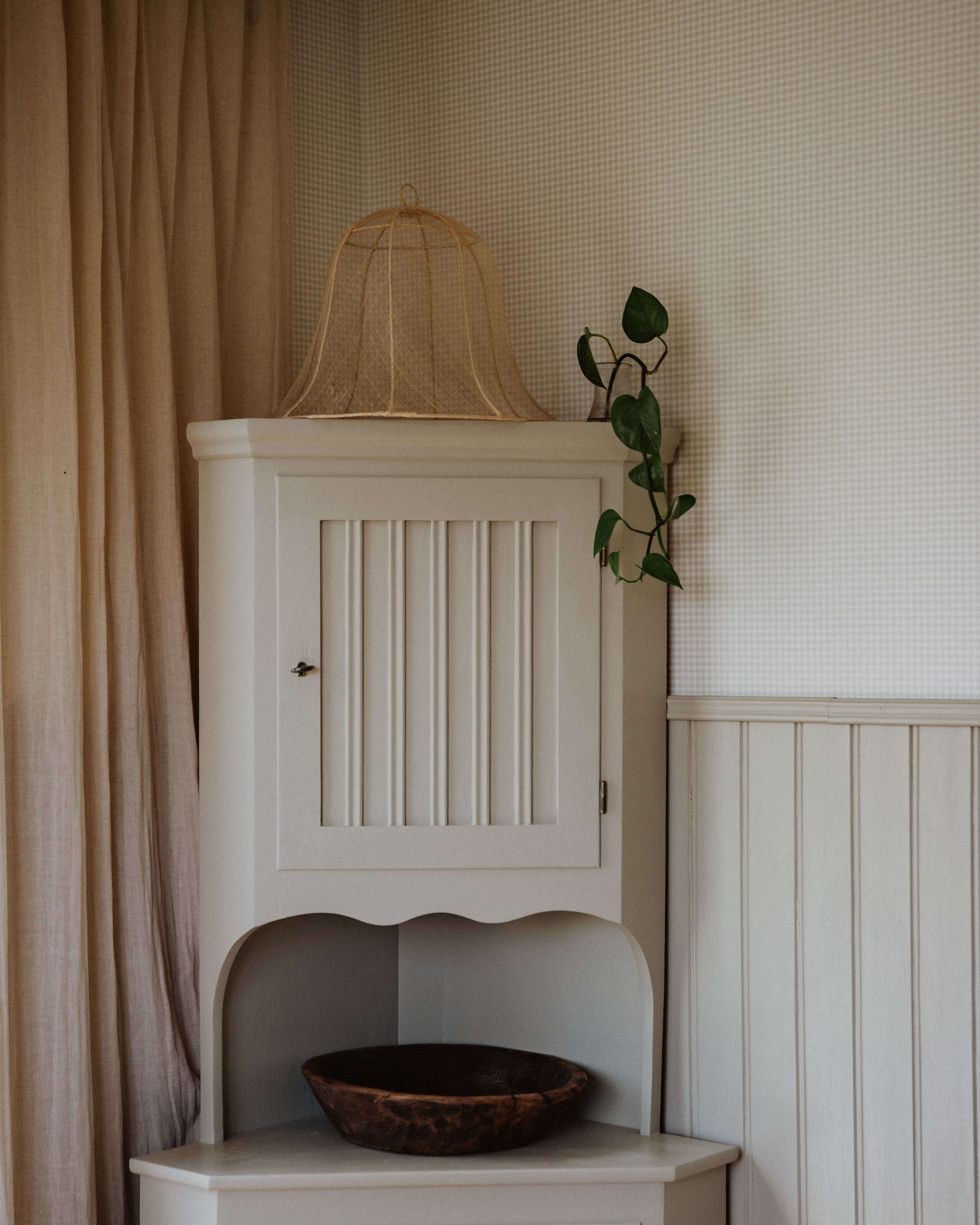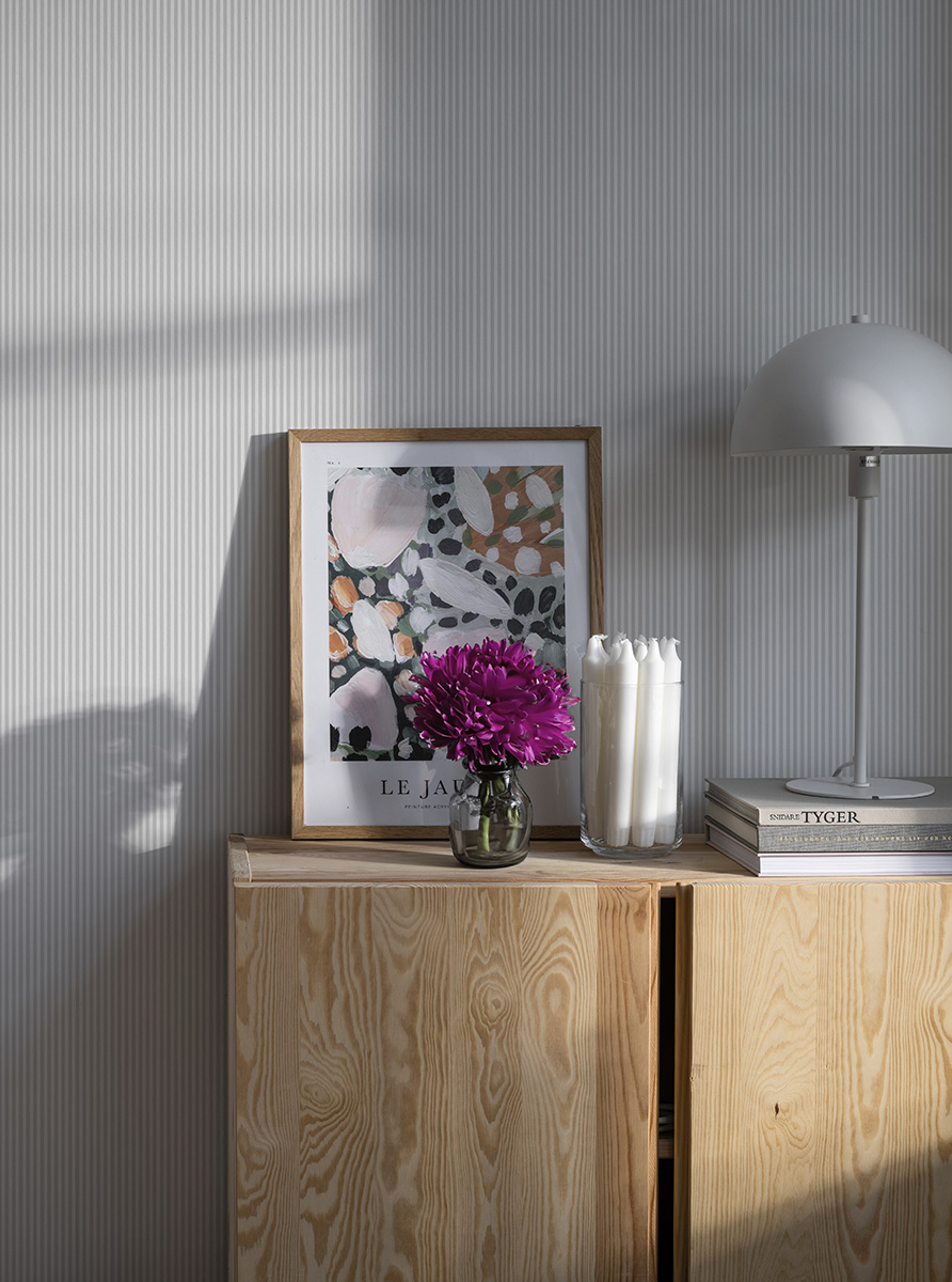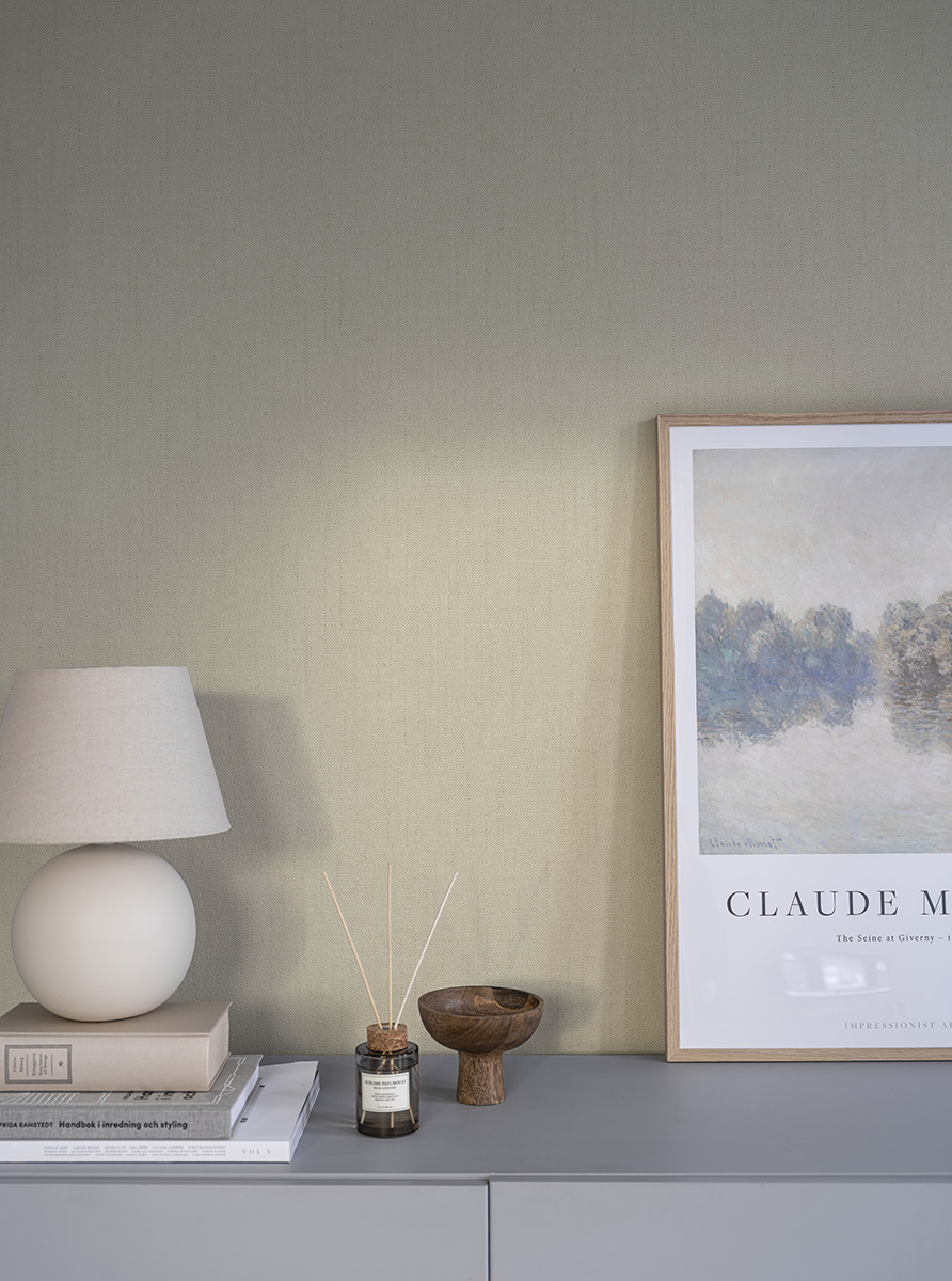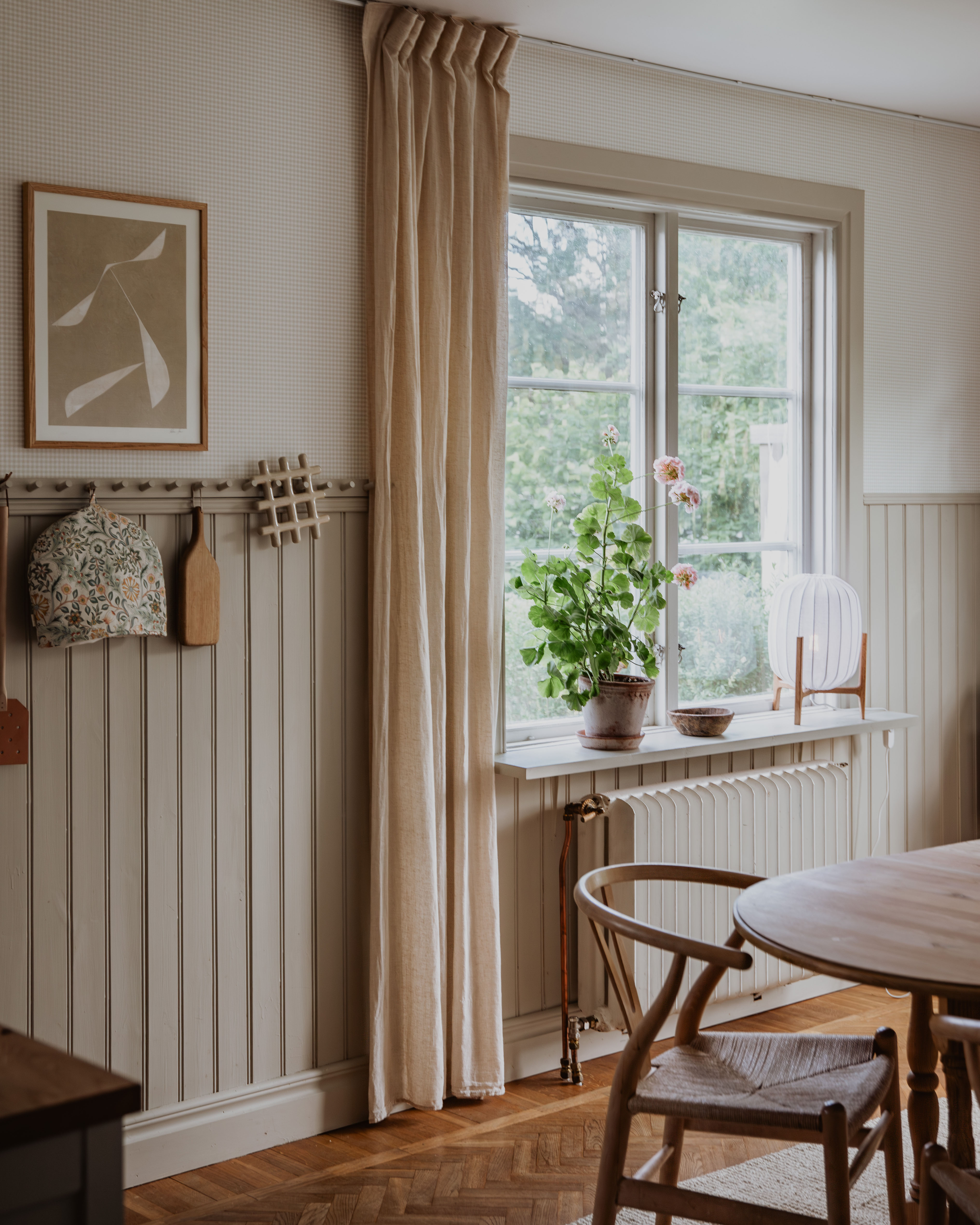 Stig in i det hemtrevliga köket hos kreatören Emelie Sundberg, där varma toner av beige och grått skapar en lugn och inbjudande miljö. I samarbete med oss har Emelie valt att ge köket ett lyft med tapeten Lotta – ett klassiskt rutmönster från vår senaste kollektion Småmönstrat. Tapeten passar perfekt pärlsponten som är målad i den mjuka nyansen NCS S 2005 Y20R.