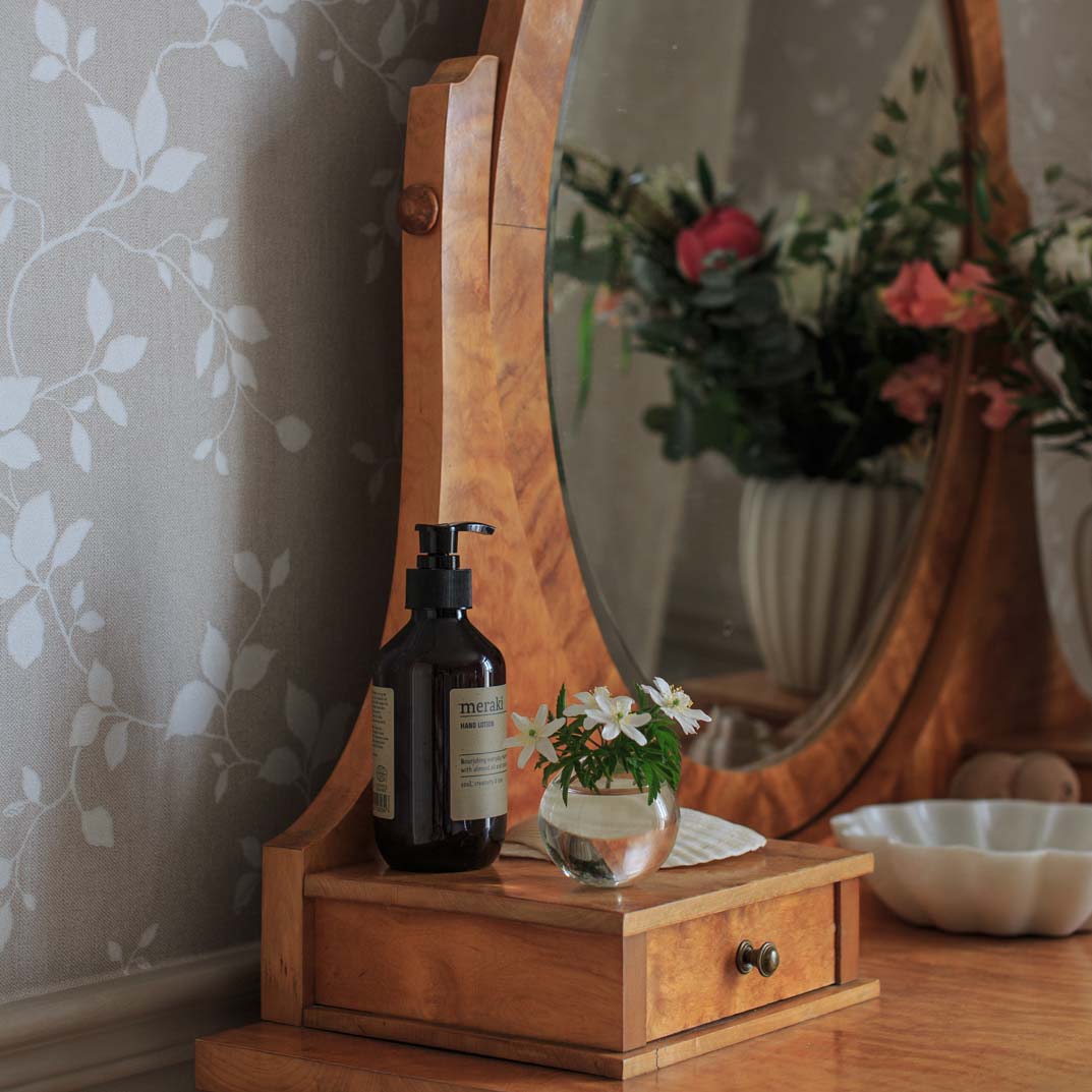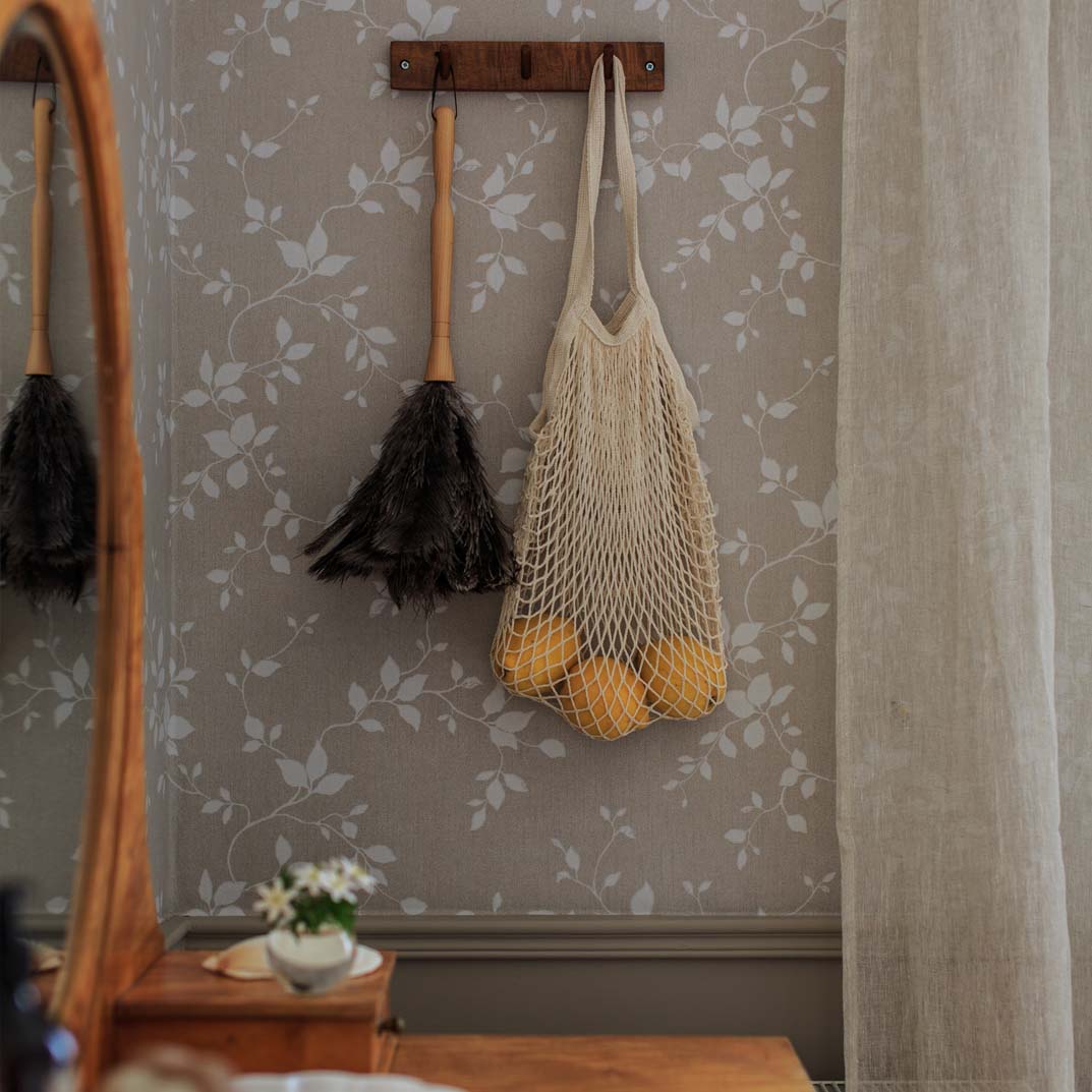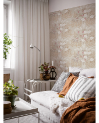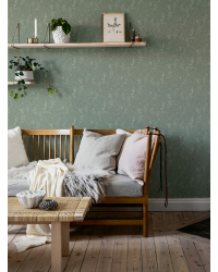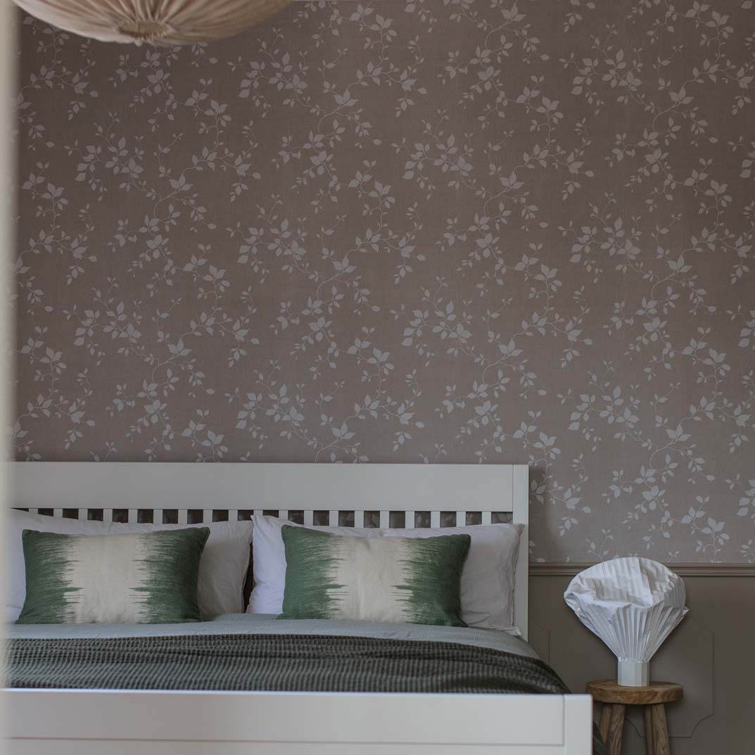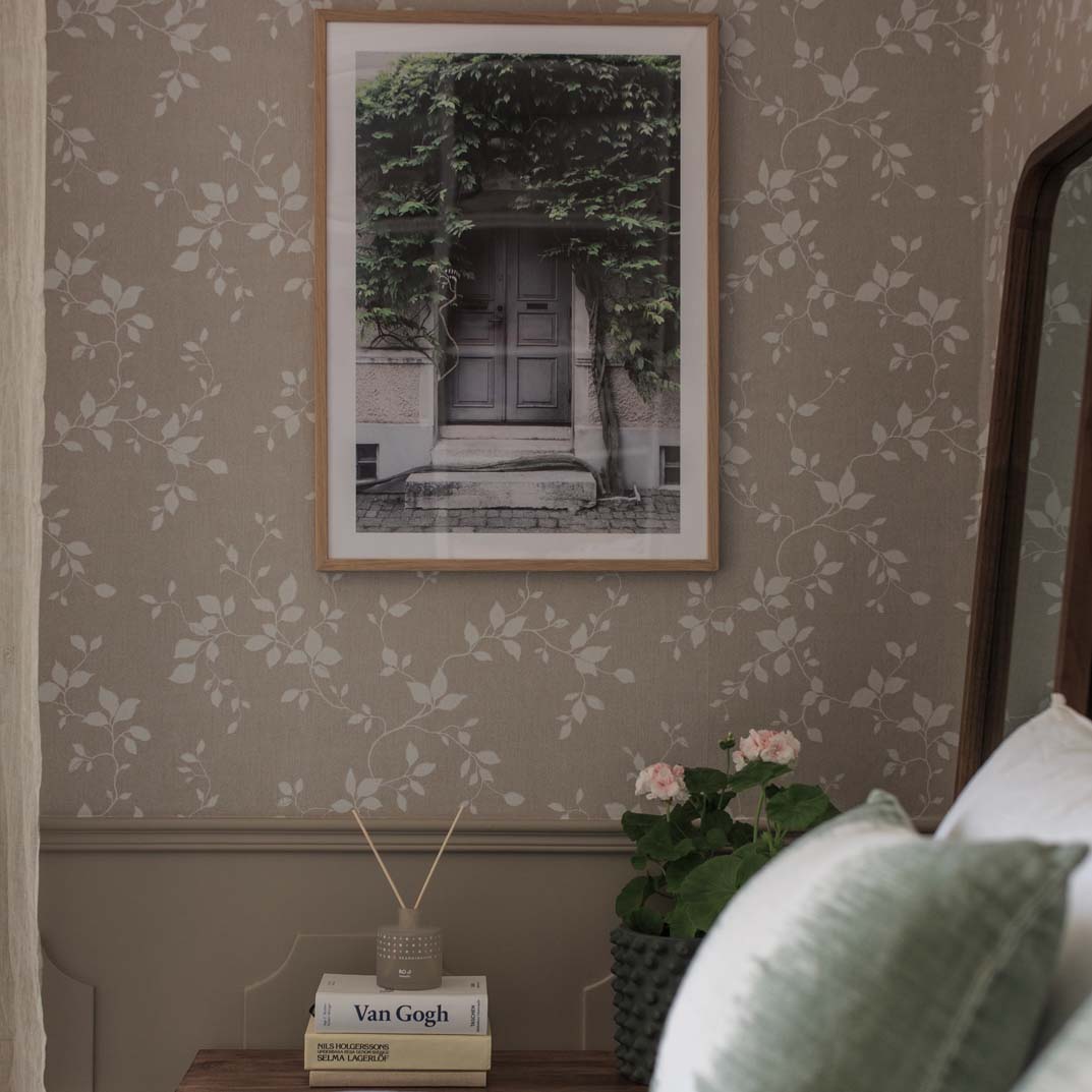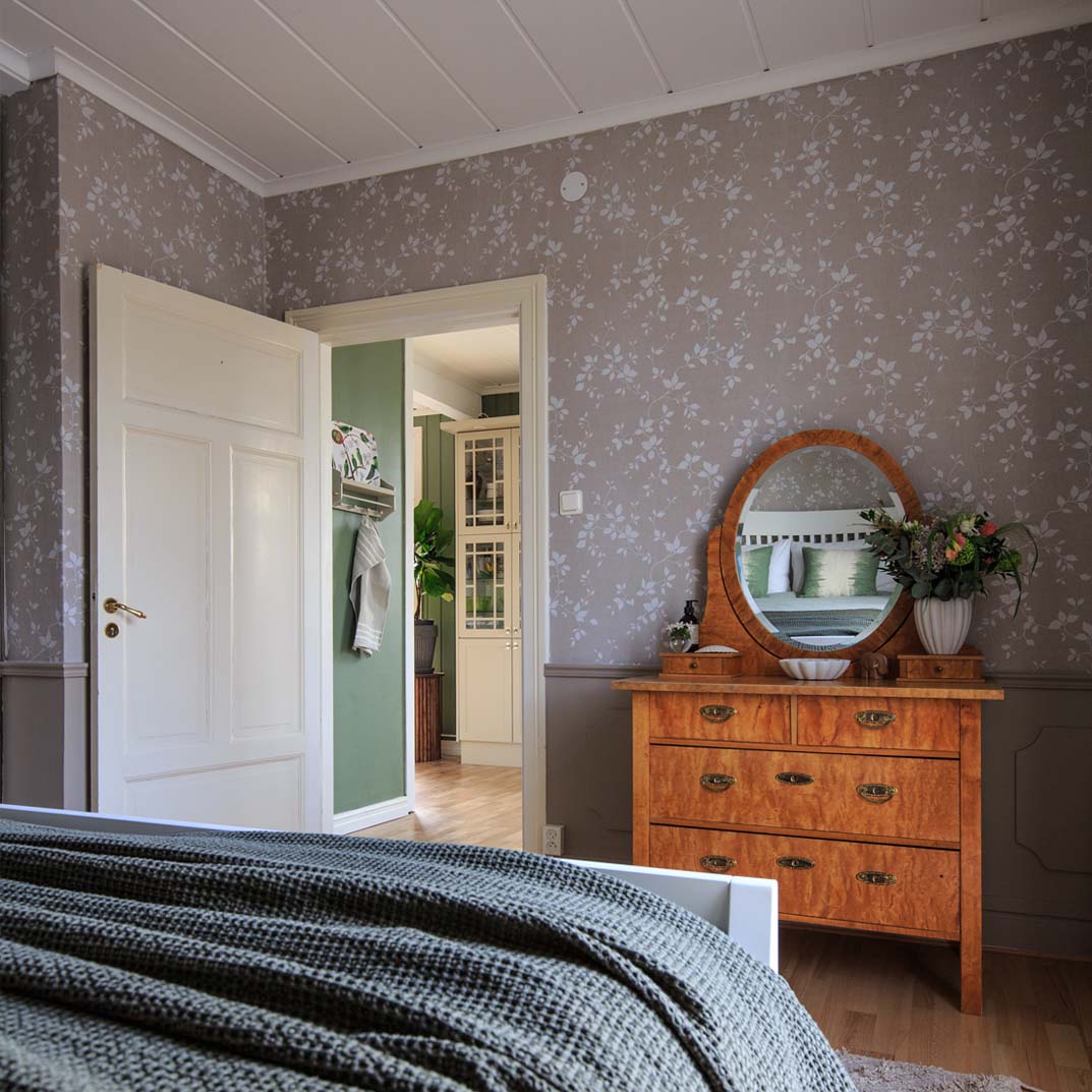 Josefines val föll på den linnefärgade tapeten Siri som passade perfekt till husets gästrum. Visionen var ett harmonisk rum med en mjuk färgskala där man kommer ner i varv. Och även om vitsipporna inte blommar hela året, så kan huset gäster alltid ligga under björkens blad och drömma sig bort.