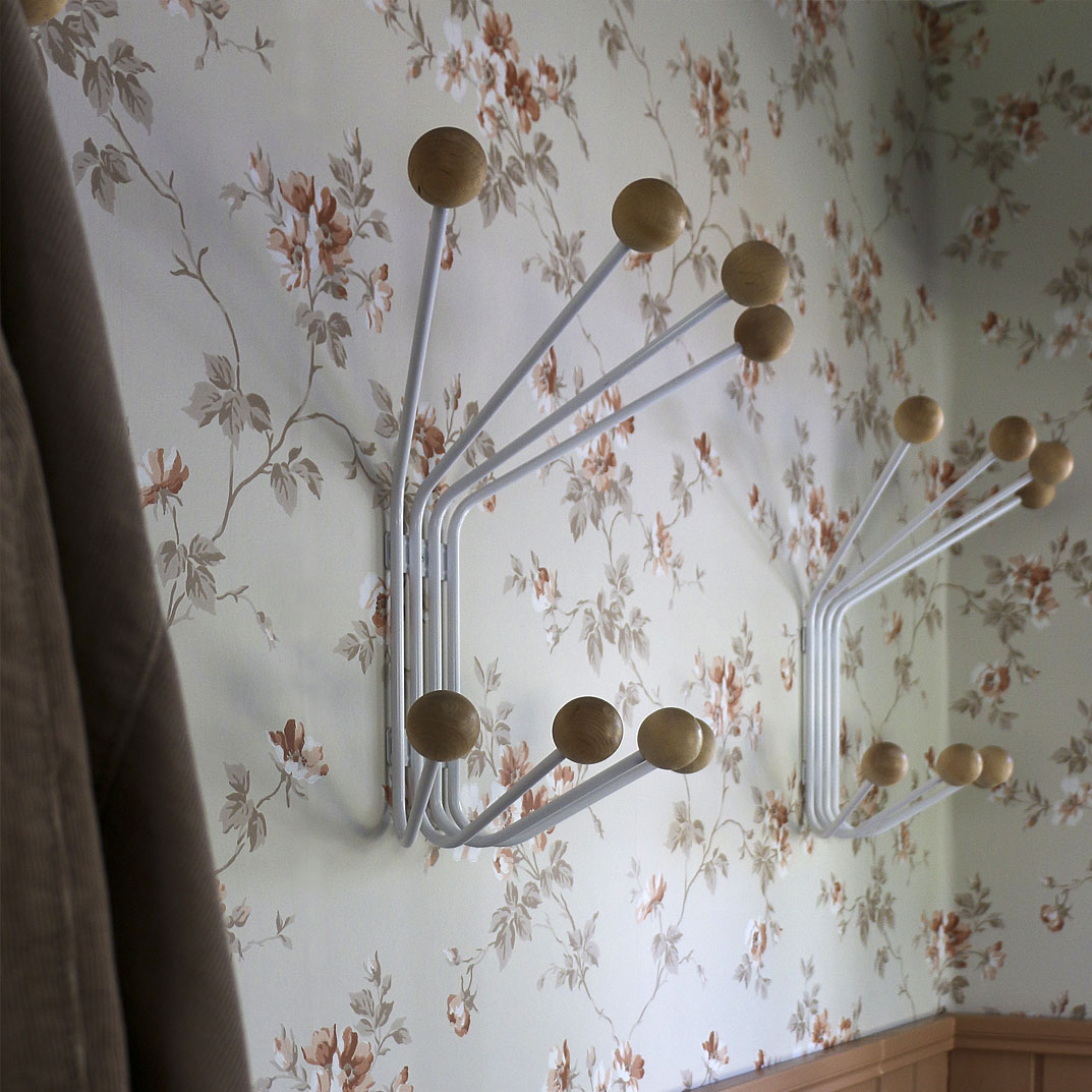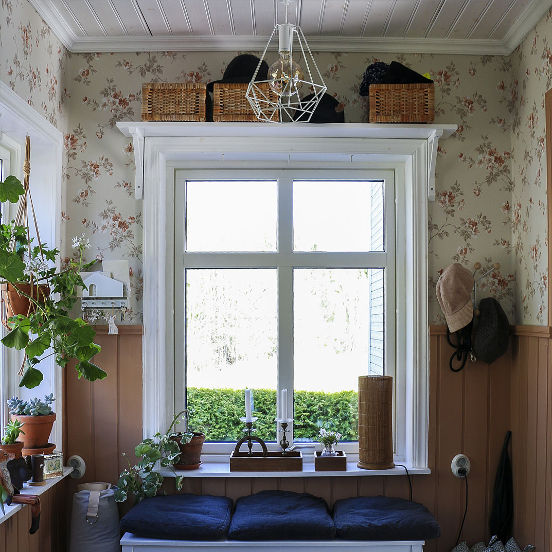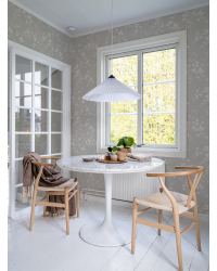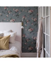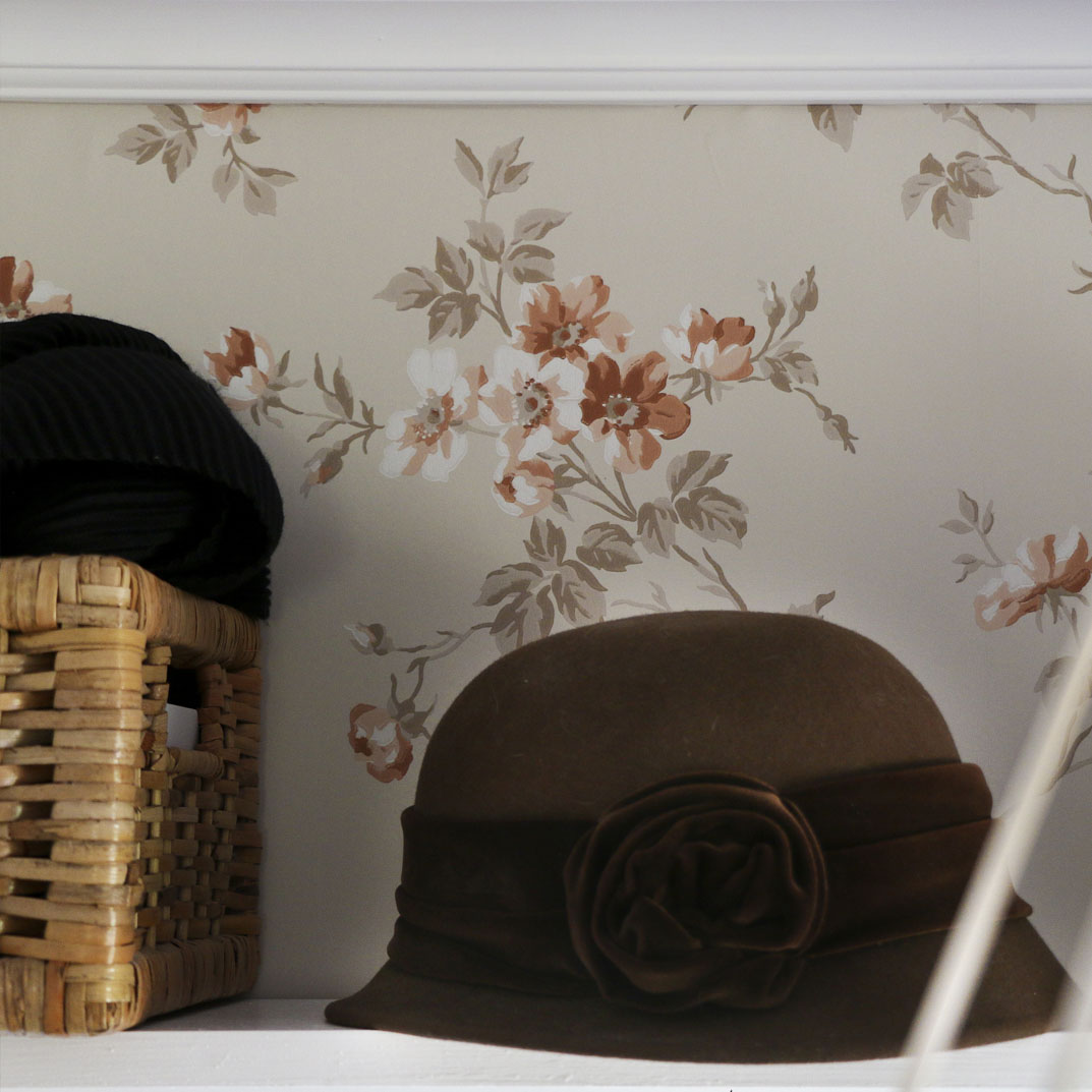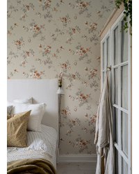 Kristina kommer ursprungligen från våra arkiv där vi fann henne i lådan märkt 1930-tal, men hon är nog snarare tidigt 1940-tal. 1940-talets tapeter hade en mjukare framtoning än tidigare. Kanske var det tidens oro som satte sin prägel på folkhemmen och dess tapeter som i kontrast istället blev lugna och romantiska. Färgerna var ofta i pastell på en beige botten, precis som i denna variant av vår klassiska Kristina.